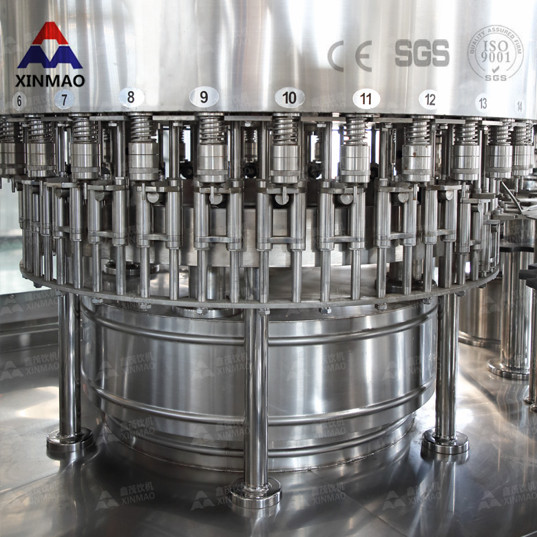 4、PET瓶純凈水灌裝機灌裝方式:采用新型的微壓灌裝,使灌裝速度更快更穩定,所以與同規格的機器相比本機產量更高,效益更大。