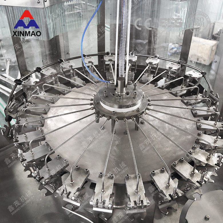 2.小型果汁飲料生產線沖洗瓶口采用先進的卡瓶頸技術,避免與螺紋口的接觸,更衛生,瓶子的輸送全部采用卡瓶頸技術,變換瓶形無需調整高度,只需變換瓶身直徑相關的護板;
