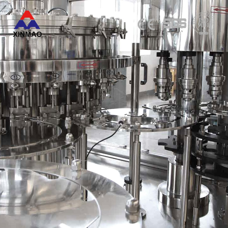 鑫茂飲料機械廠家生產供應的全自動汽水飲料灌裝機將沖洗、灌裝、封蓋三功能組合在一個機體上,全過程實現自動化,適用于適用于灌裝可口可樂、雪碧、含氣蘇打水等含二氧化碳氣體的飲料。