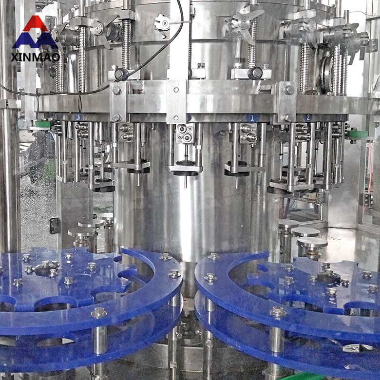 由進(jìn)瓶輸送帶送進(jìn)機(jī)器的酒瓶被進(jìn)星輪分成固定間隔進(jìn)入沖瓶機(jī),通過瓶夾將瓶倒立,完成洗瓶,然后瓶子有中間波輪將其送進(jìn)灌裝機(jī)的進(jìn)瓶星輪。酒瓶經(jīng)提升裝置的提升運(yùn)動由對中導(dǎo)向定位于灌裝部件的下方。經(jīng)灌裝后,瓶托降下,對中導(dǎo)向上起,酒瓶被送到傳送星輪,然后送進(jìn)壓蓋星輪。壓蓋過程結(jié)束后,出瓶星輪將壓好蓋的酒瓶傳送到出瓶輸送帶上。