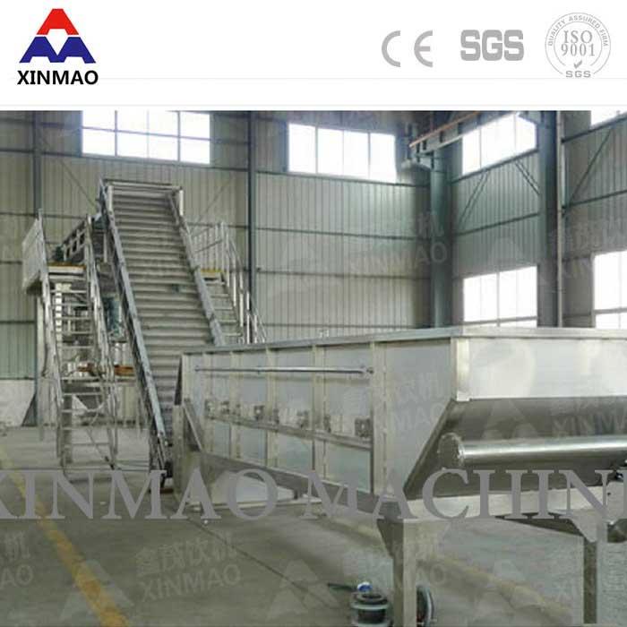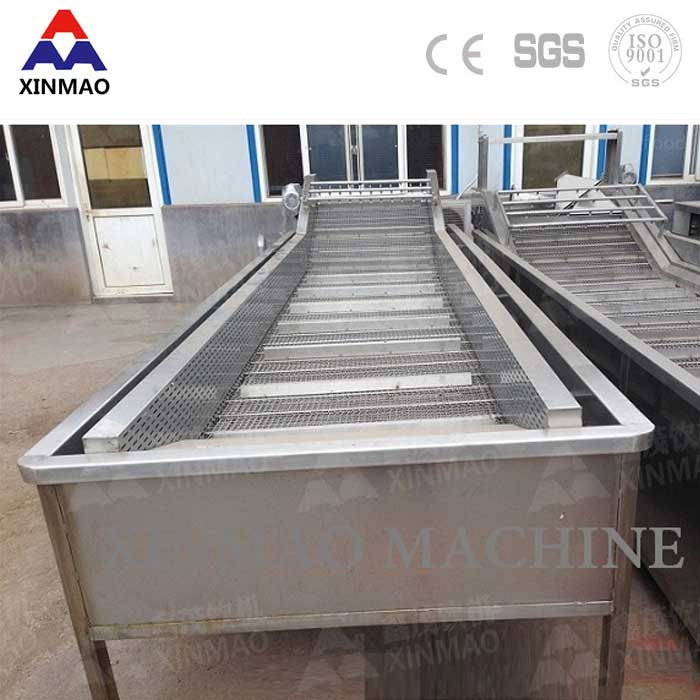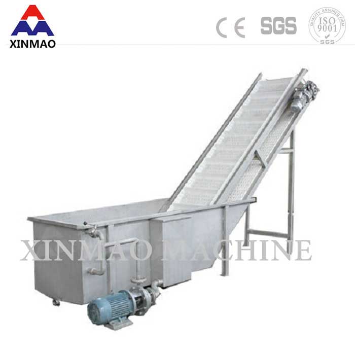 物料落入水中,利用槽體中翻騰的水將物料攪動清洗,物料上帶有的泥沙等重污物脫離后落入過濾網下面的沉淀區,物料在水的推動下逐漸移動到輸送網帶上,被提升出內槽體,再經過噴淋清洗,將物料二次洗凈,進入下面的工序。清洗下來的漂洗物,經過濾網攔截。工作過程中,進水管和噴淋水管始終供水,使水箱內的污水逐步被替換。
