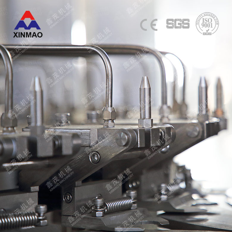 飲用水灌裝設備灌裝部分實現將物料灌裝到由沖瓶機送過來的洗好的瓶子中。