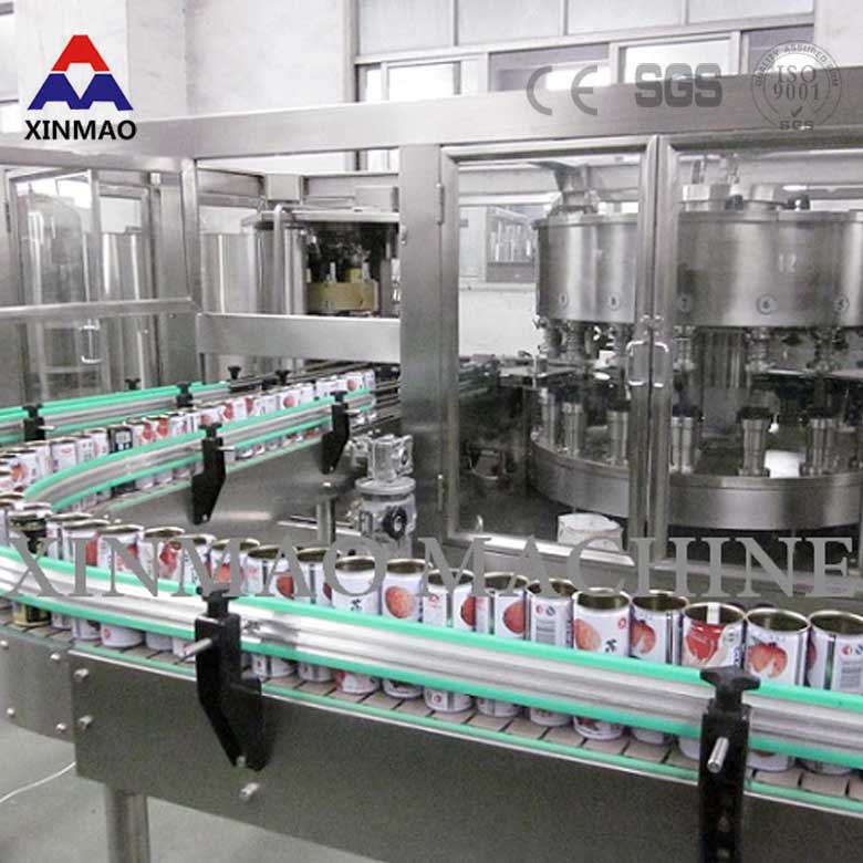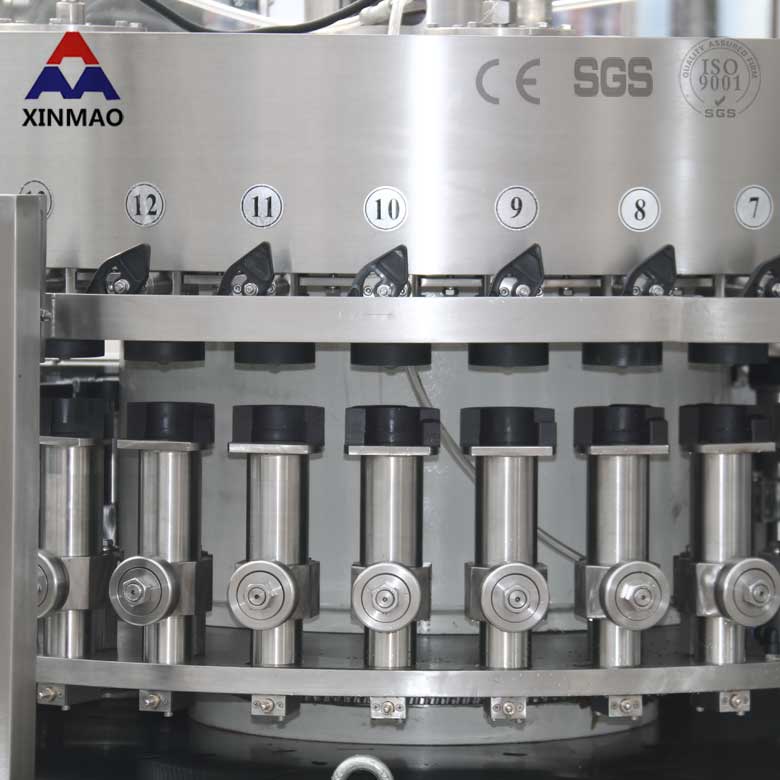 本機是在消化吸收國內外(不含汽)易拉罐灌裝封罐機(封口機)的基礎上張家港鑫茂開發的設備。采用常壓灌裝原理,當空罐經撥輪進入升降托罐盤后,灌裝閥和空罐對中,空罐升起并密封,同時自動打開灌裝閥的閥口,當灌裝液面堵住閥的回氣管口時停止灌裝。灌好的罐子經鉤子鏈送到封口機頭,蓋子經送蓋器及壓頭把蓋子送到罐口上,當托罐機構升起時,壓頭壓緊罐口,封口輪先預封再實封,罐子封好后被打蓋機構的打頭推出,然后進入出罐輸送。
