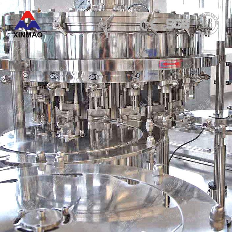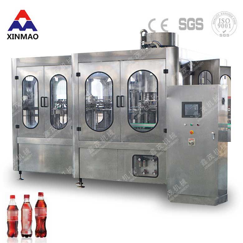 鑫茂飲料機(jī)械生產(chǎn)的碳酸飲料灌裝設(shè)備將沖洗、灌裝、封蓋三功能組合在一個(gè)機(jī)體上,全過程實(shí)現(xiàn)自動(dòng)化,適用于適用于灌裝可口可樂、雪碧、含氣蘇打水等含二氧化碳?xì)怏w的飲料。